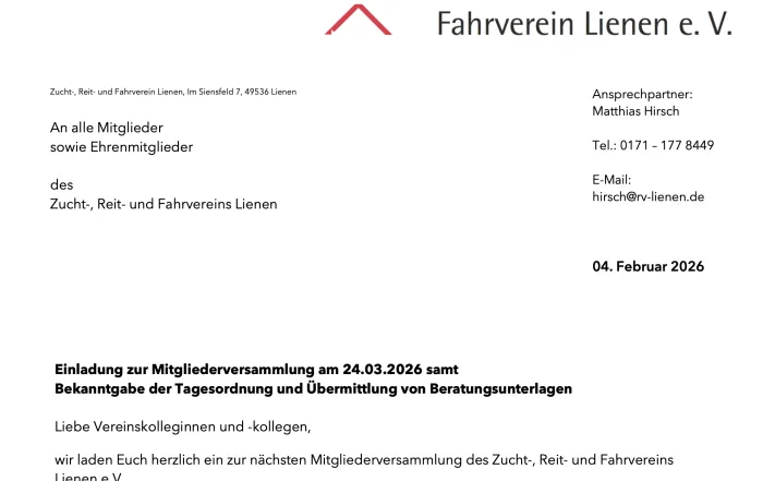 Wir laden Euch herzlich ein zur Mitgliederversammlung am Dienstag, 24.03.2026 um 20.00 Uhr in das Reiterstübchen an unserer Vereinshalle, Nigge Weg 11, 49536 Lienen. Unsere Einladung mit der Bekanntgabe der Tagesordnung findet Ihr hier: [...]